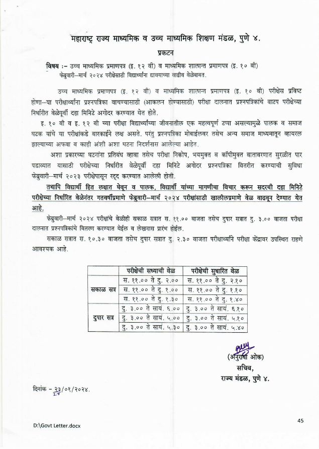 उच्च माध्यमिक प्रमाणपत्र  ( इ. १२ वी ) व माध्यमिक शालान्त प्रामाणपत्र  ( इ. १० वी )  परीक्षेस प्रविष्ट होणाऱ्या परीक्षार्थ्यांना वाचण्यासाठी ( आकलन होण्यासाठी) प्रश्न प्रश्नपत्रिकांचे वाटप निर्धारीत वेळेपूर्वी दहा मिनिटे अगोदर करण्यात येत होते. परीक्षा निकोप, भयमुक्त व कॉपीमुक्त वातावरणात सुरळीत पार पडाव्यात यासाठी परीक्षेच्या निर्धारीत वेळेपूर्वी दहा मिनिटे अगोदर प्रश्नपत्रिका वितरीत करण्याची सुविधा फेब्रुवारी -मार्च  २०२३ परीक्षेपासून रद्द करण्यात आलेली होती.