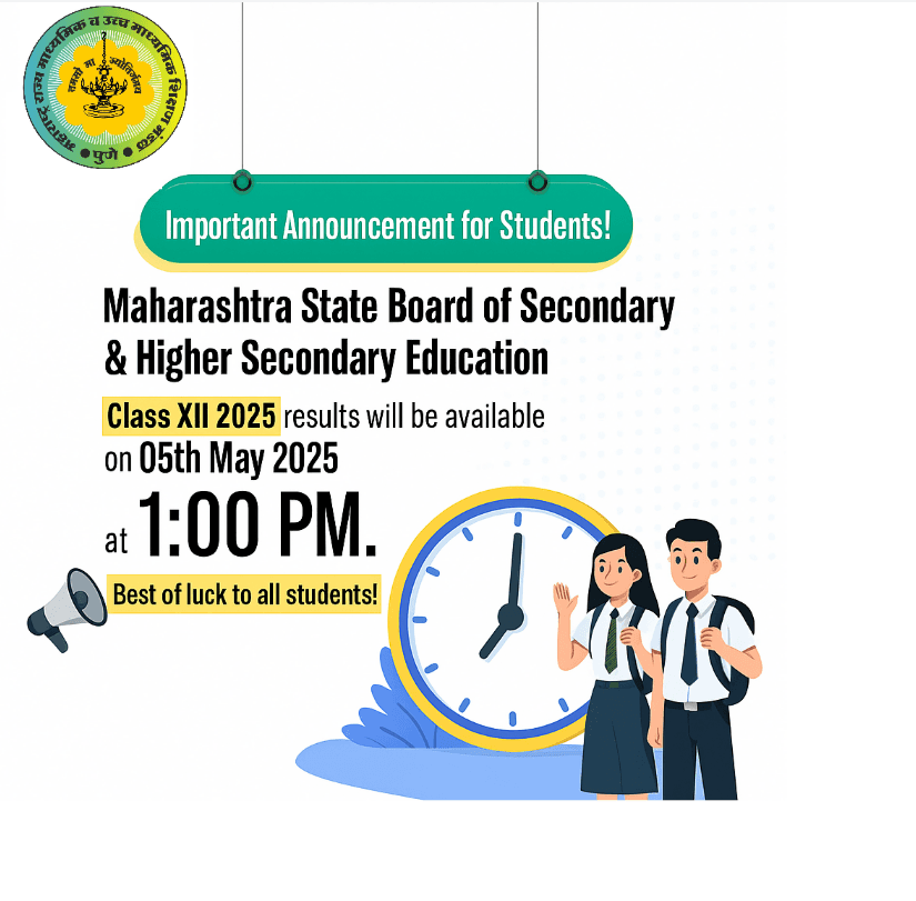 महाराष्ट्र राज्य माध्यमिक व उच्च माध्यमिक शिक्षण मंडळाच्या पुणे, फेब्रुवारी-मार्च २०२५ मध्ये घेण्यात आलेल्या उच्च माध्यमिक प्रमाणपत्र (इ. १२ वी) परीक्षेचा निकाल खालील अधिकृत संकेतस्थळांवर मंगळवार दिनांक ०५/०५/२०२५ रोजी दुपारी १.०० वाजता ऑनलाईन जाहीर करण्यात येत आहे.